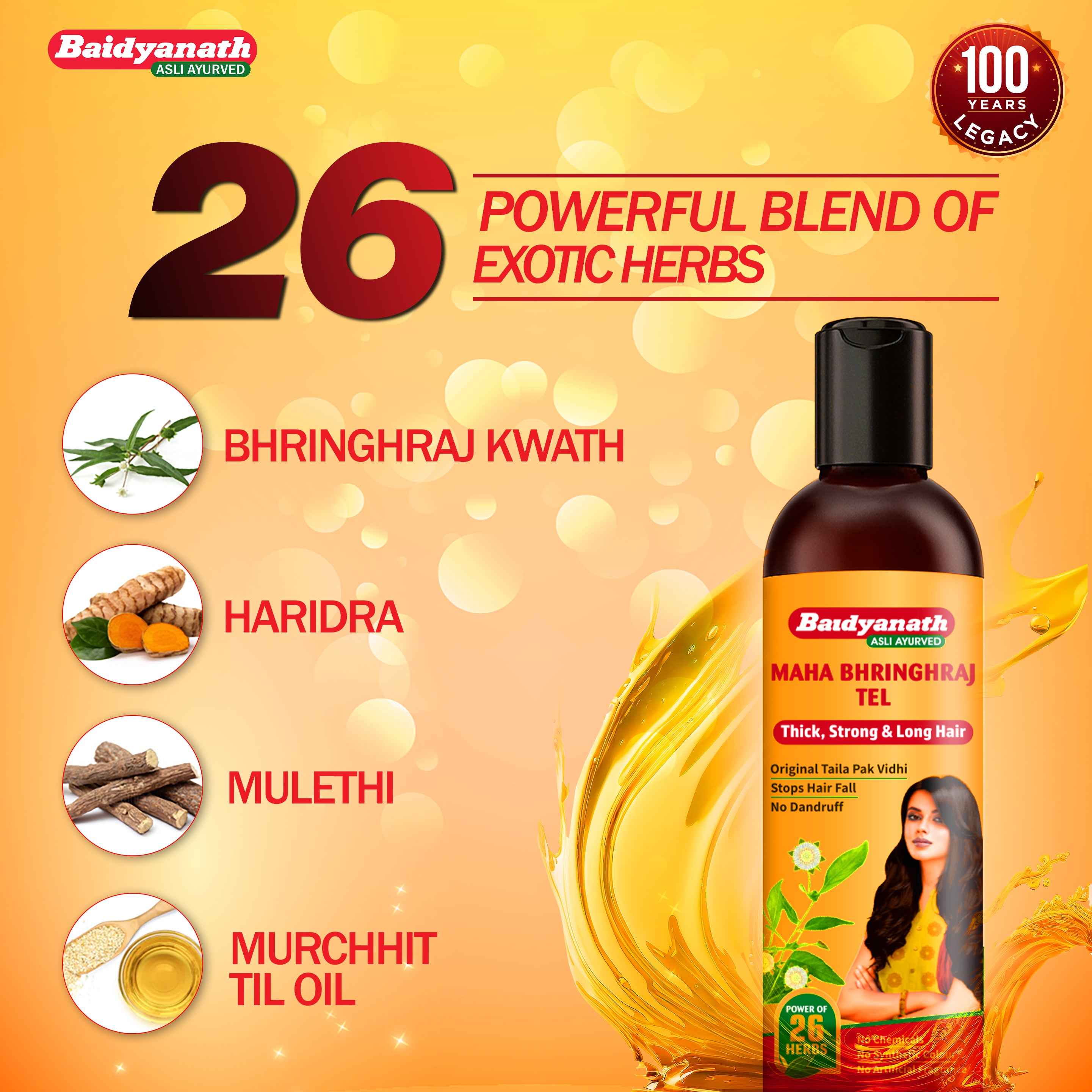 Baidyanath Mahabhringraj Tel is a classical Ayurvedic hair oil, prepared with 26 time-honoured herbs in pure Til Oil using the traditional Taila Pak Vidhi. This authentic formulation helps reduce hair fall, strengthens roots, fights dandruff, and promotes thicker, healthier hair.