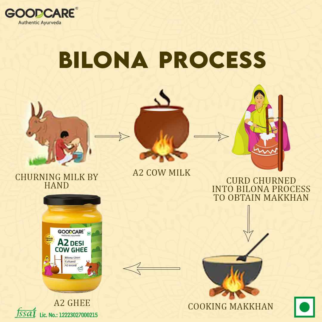Goodcare A2 Desi Cow Ghee made from the milk of free-range Gir cows, cultured using the traditional hand-churning Bilona method. This method preserves the nutritional value of the ghee, ensuring unmatched quality and taste.Elevate your well-being with every spoon.