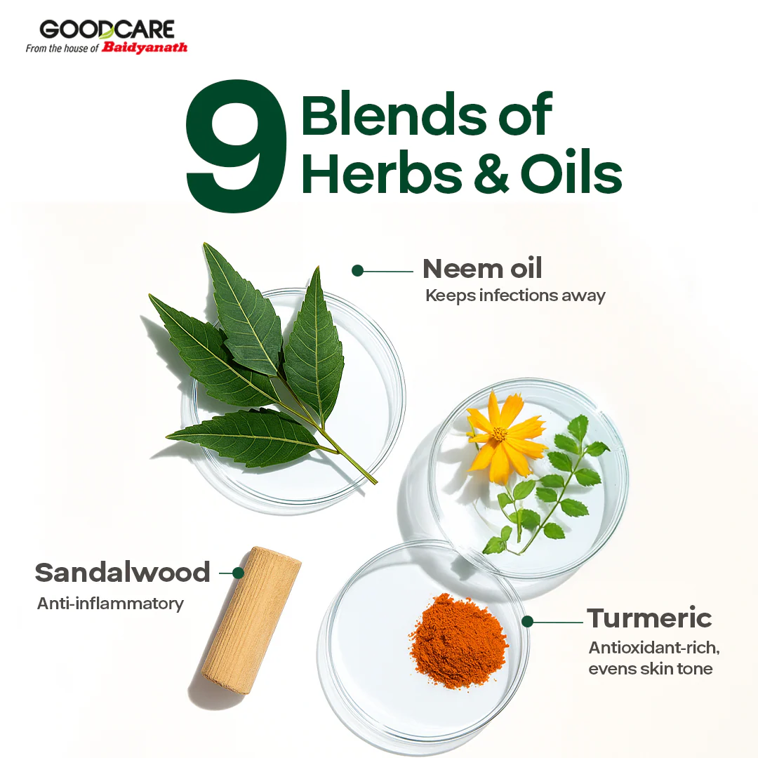 Goodcare Neem Guard Body Oil is a powerful blend of 10 skin-nourishing herbs & oils like Neem, Almond Oil, Sandalwood, Daruharidra, Haldi, Manjishtha, Lodhra & more. Experience the antifungal effects of neem which helps relieve rashes, burns, insect bites and other skin irritations. Indulge in a relaxing body massage with our non-sticky rejuvenating oil as it helps provide intense moisture & suppleness.
