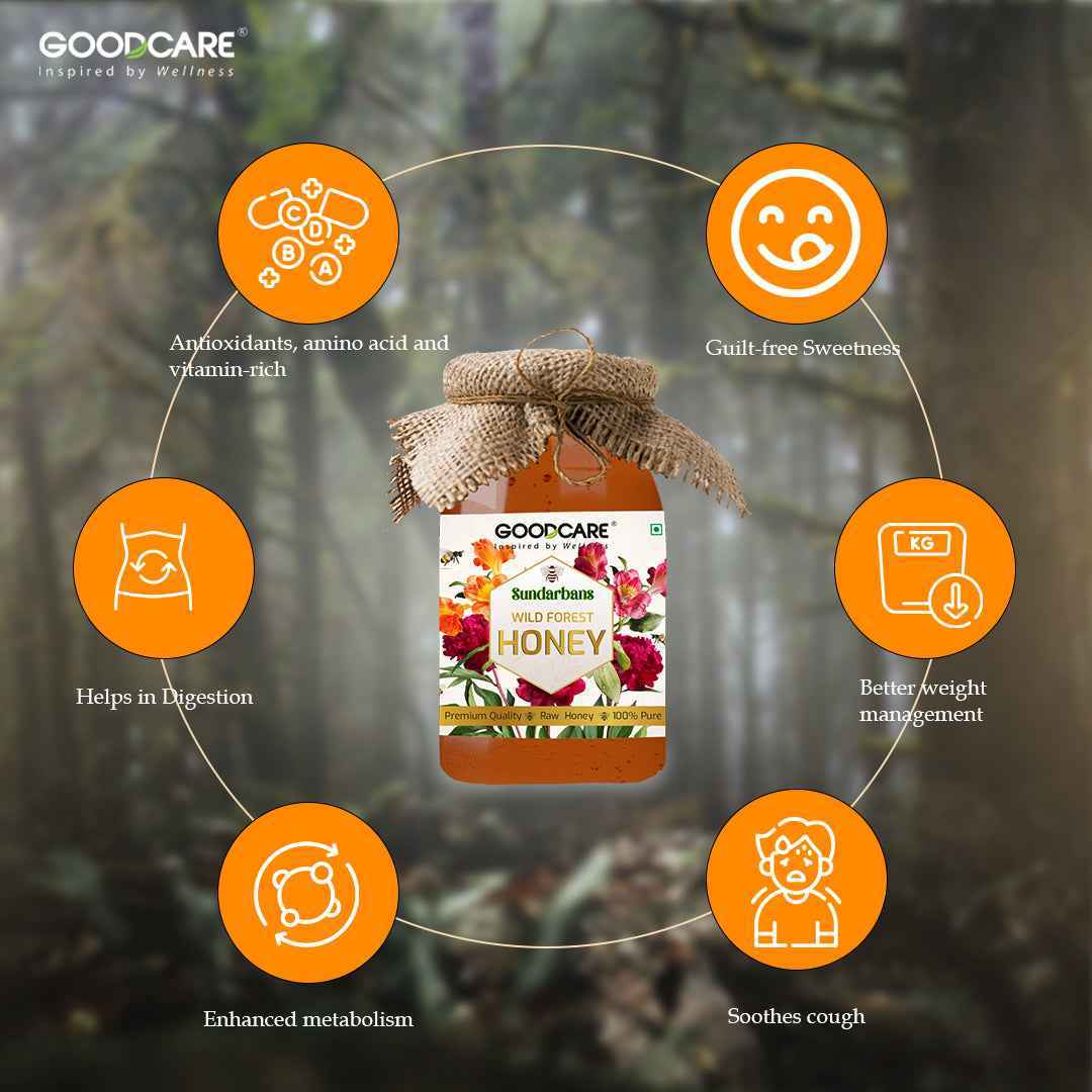 GoodCare Wild Forest Honey is a pure, raw, and nutrient-rich honey sourced from the Sundarbans. Packed with natural vitamins, minerals, amino acids, and antioxidants, it boosts energy, supports immunity, and helps soothe cough, cold, and sore throat. With its distinctive flavour and natural healing properties, this honey is perfect for daily use—whether added to food, warm drinks, or used in skincare and haircare for enhanced health and nourishment.