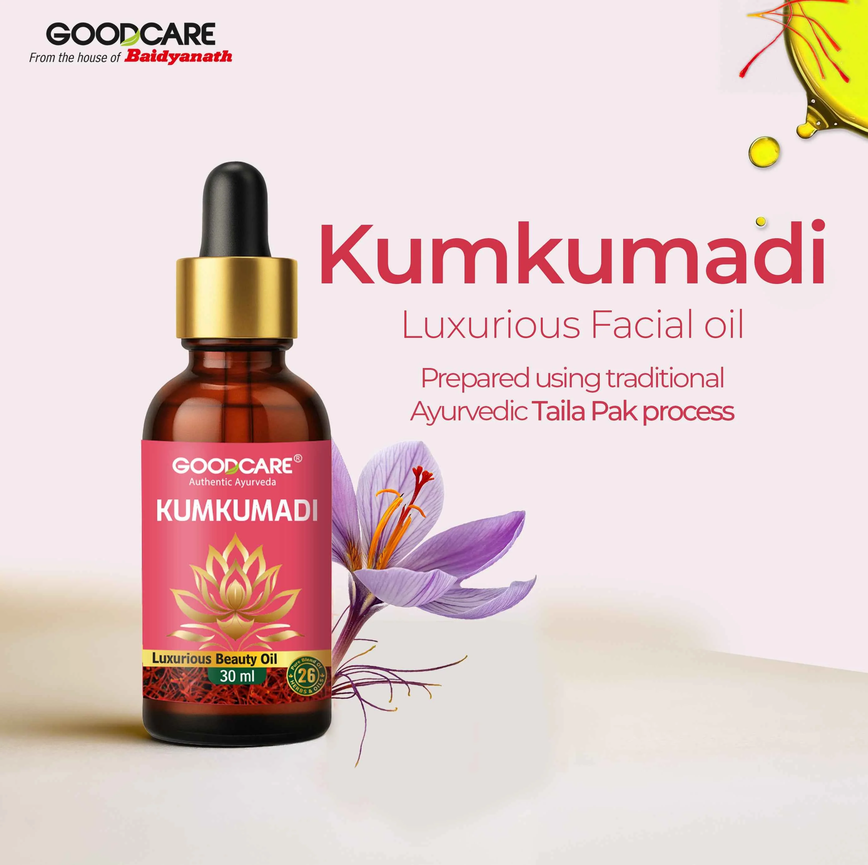 - GoodCare Kumkumadi Oil Promotes a radiant glow, moisturizes and rejuvenates skin.