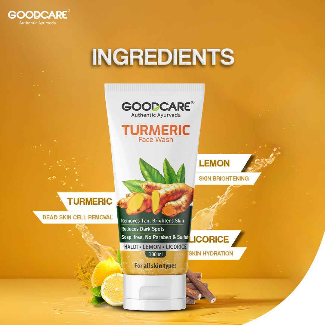 Goodcare Turmeric Face Wash is an antiseptic cleanser that helps protect your skin from daily exposure to harsh environments, revealing a bright & clear skin. It is made with pure extracts of Turmeric, Lemon & Licorice. Turmeric, with its natural brightening properties, helps unveil a fresh & radiant glow. It helps remove dead skin cells, controls oil production & hydrates the skin. This soap-free, paraben & sulfate-free face wash also helps reduce suntan, dark spots & blemishes.