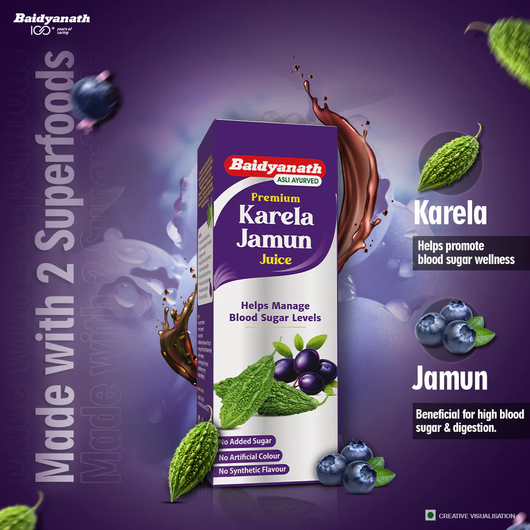Baidyanath Premium Karela Jamun Juice is a nutritious health drink that helps maintain healthy blood sugar levels naturally. It is a pure juice with no added sugar, colour or synthetic flavour. It is extracted from high-quality karela & jamun, retaining maximum nutrients and benefits. Karela contains Polypeptide-P & Jamun is rich in Flavonoids, Polyphenols, Antioxidants, Iron & Vitamin C. Together, they help improve sugar metabolism and are linked to effective blood sugar management. Baidyanath Karela Jamun Juice acts as a blood purifier that helps ward off infections & promotes healthy skin. It may help remove intestinal tract worms & supports the overall digestive & liver health.